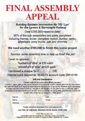 Each ticket is £5 and only 2000 have been printed. Already several hundred have been snapped up and to buy your tickets, e-mail or write to Jon Pain, 26 Oaklands, Bideford, North Devon EX39 3HW. Cheques made payable to the 762 Club please. This really is a marvelous opportunity to make preservation history and help LYN get completed and into traffic next year.